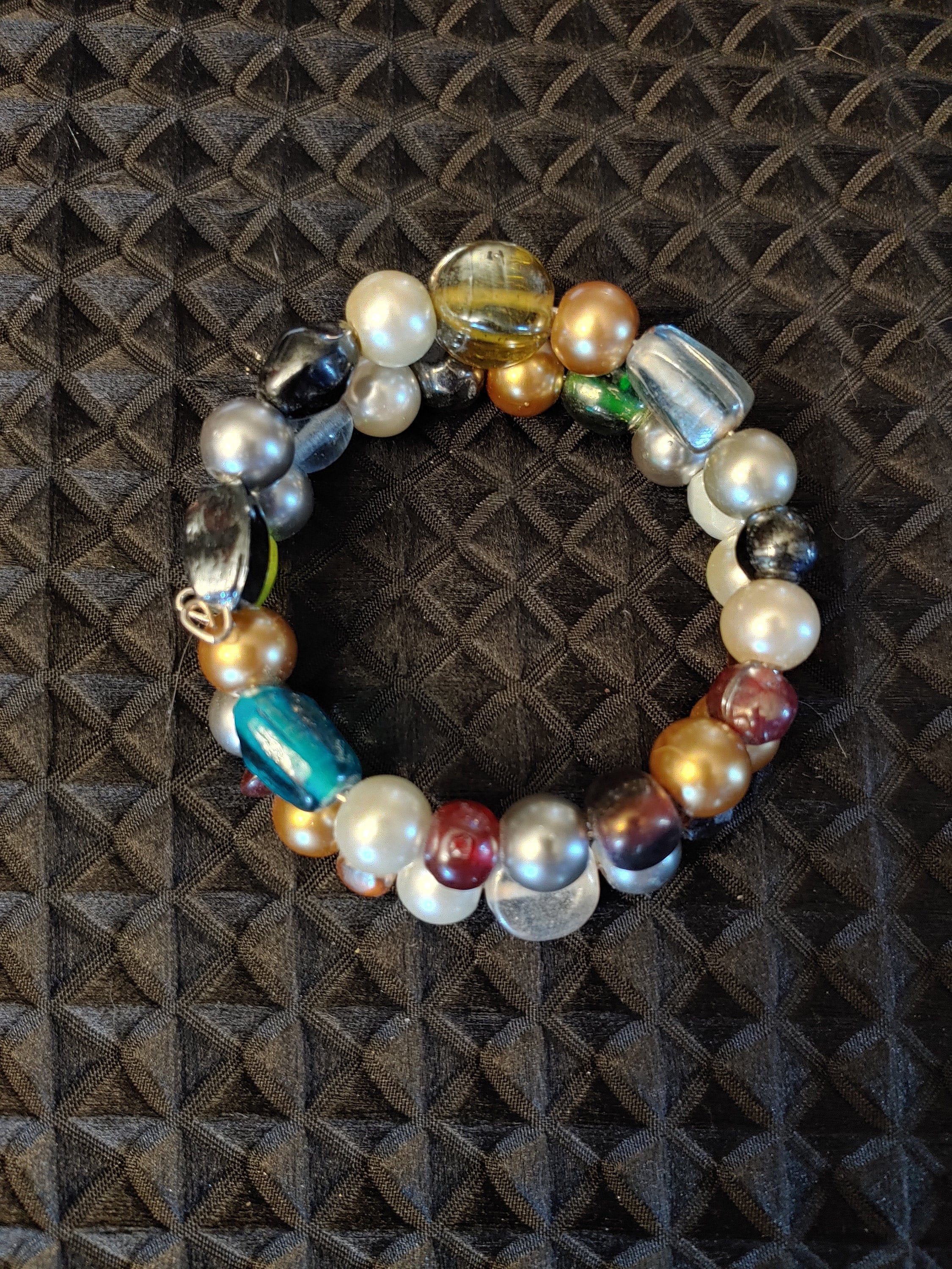 MEMORY WIRE BRACELET WITH VARIOUS COLORED BEADS. BRACELET COILS AROUND YOUR WRIST. DEPENDING ON THE SIZE OF YOUR WRIST, YOU WILL HAVE ONE OR TWO STRANDS.