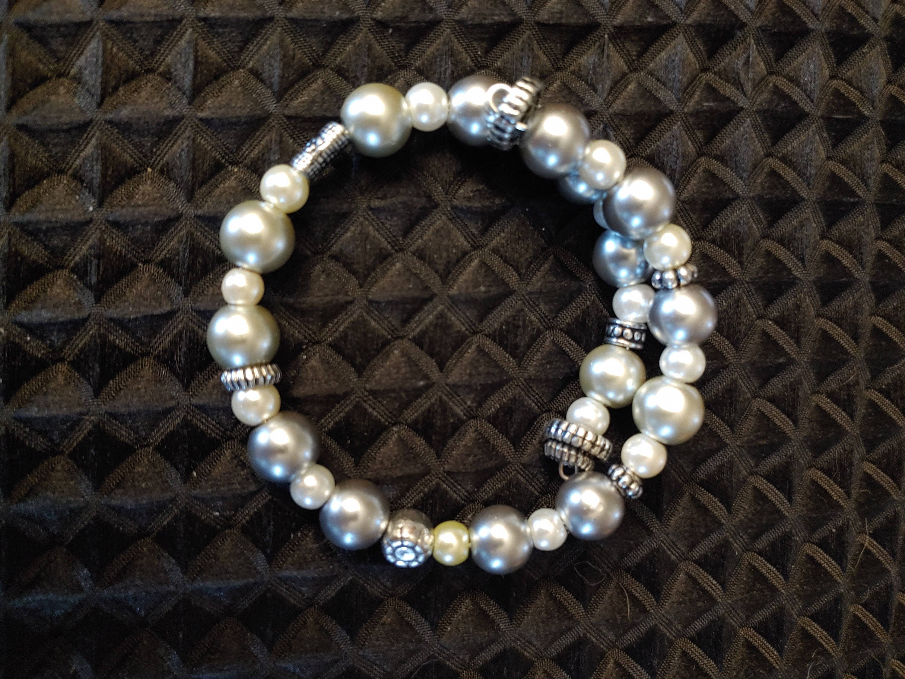 MEMORY WIRE BRACELET WITH WHITE PEARL BEADS. BRACELET COILS AROUND YOUR WRIST. DEPENDING ON THE SIZE OF YOUR WRIST, YOU WILL HAVE ONE OR TWO STRANDS.