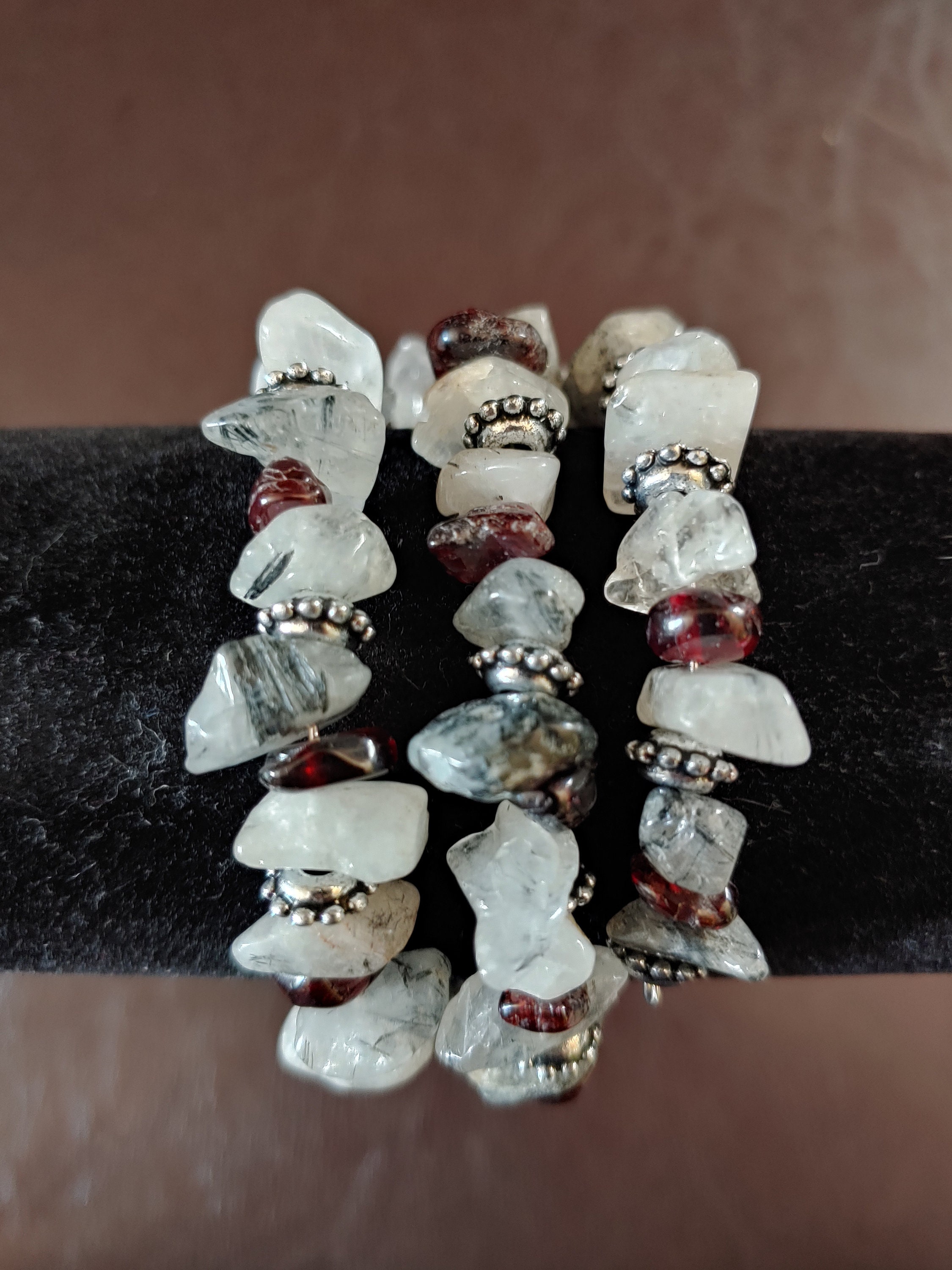 MEMORY WIRE BRACELET WITH TOURMALINE QUARTZ & GARNET BEADS. BRACELET COILS AROUND YOUR WRIST. DEPENDING ON THE SIZE OF YOUR WRIST, YOU WILL HAVE TWO OR THREE STRANDS.