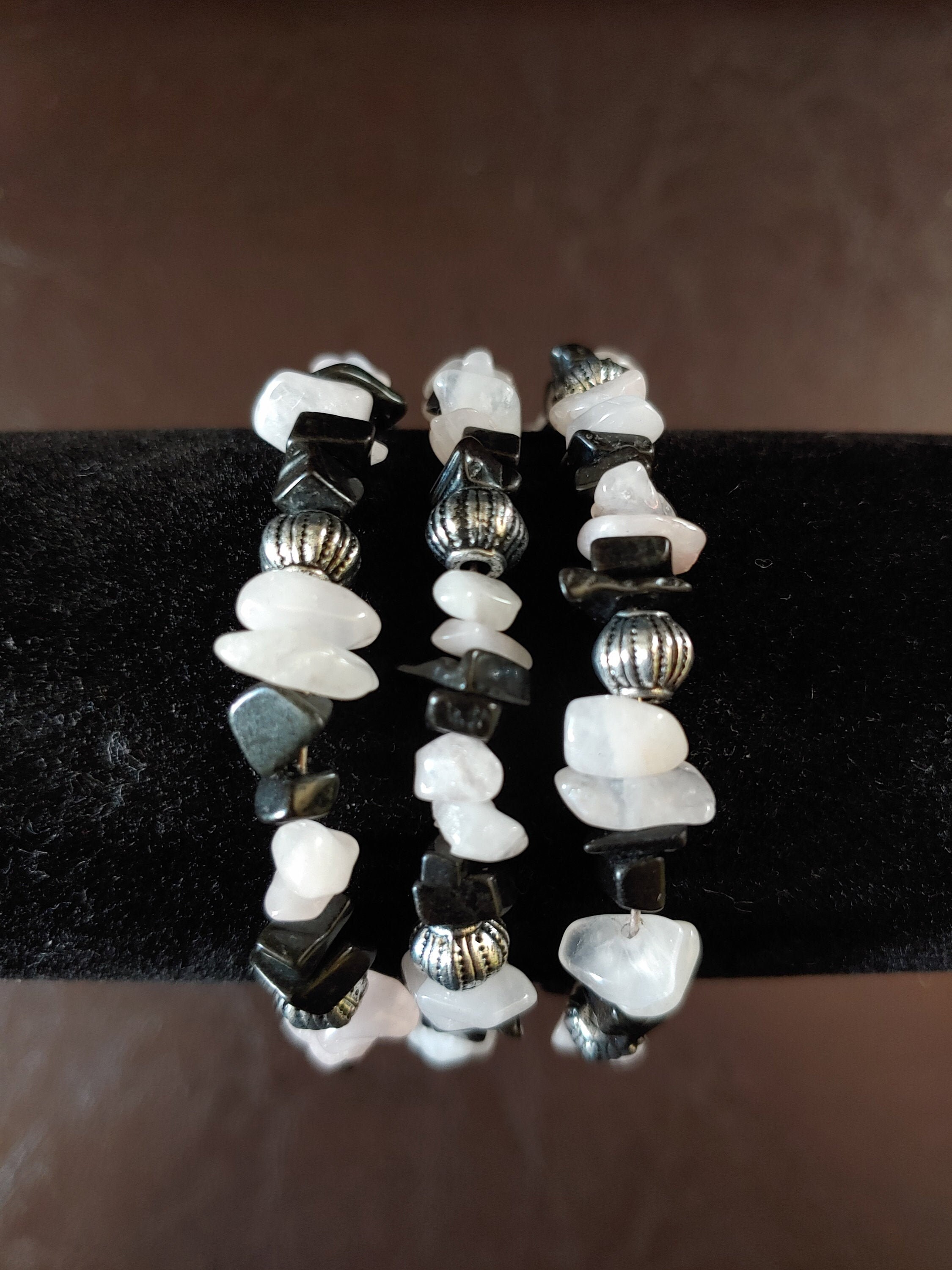 MEMORY WIRE BRACELET WITH BLACK & PINK CHIP BEADS. BRACELET COILS AROUND YOUR WRIST. DEPENDING ON THE SIZE OF YOUR WRIST, YOU WILL HAVE TWO OR THREE STRANDS.