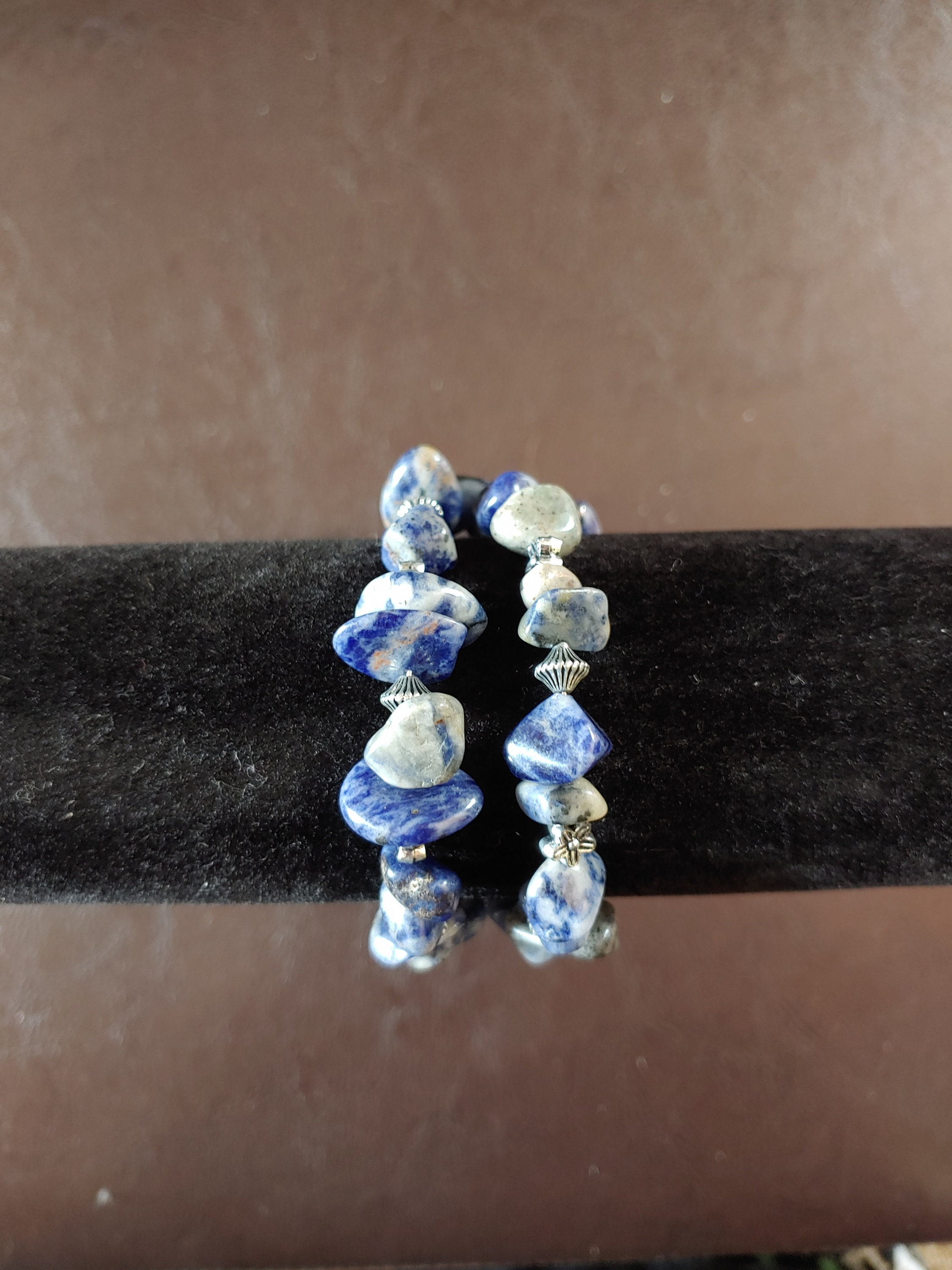 MEMORY WIRE BRACELET WITH SODALITE BEADS. BRACELET COILS AROUND YOUR WRIST. DEPENDING ON THE SIZE OF YOUR WRIST, YOU WILL HAVE TWO OR THREE STRANDS.