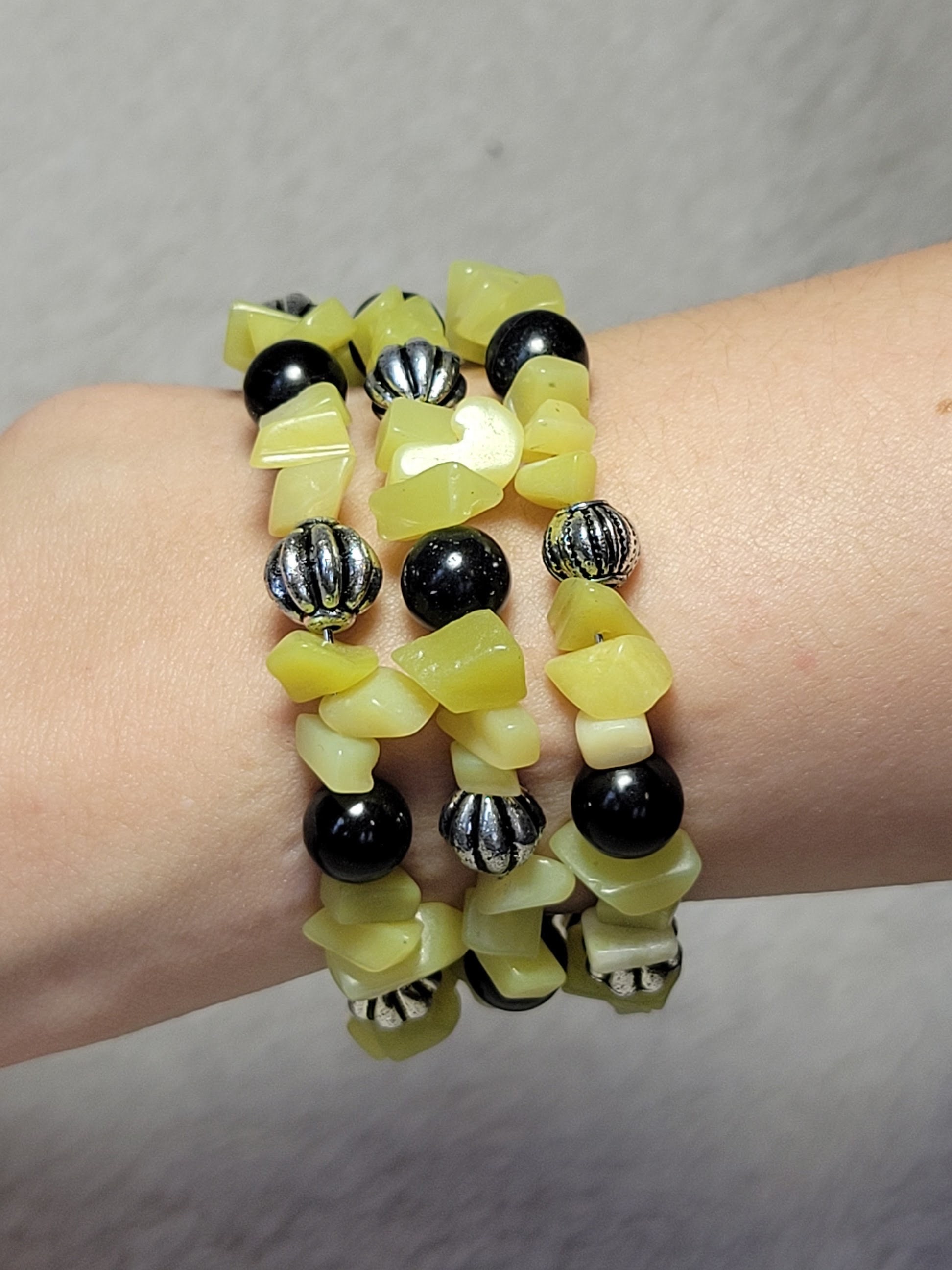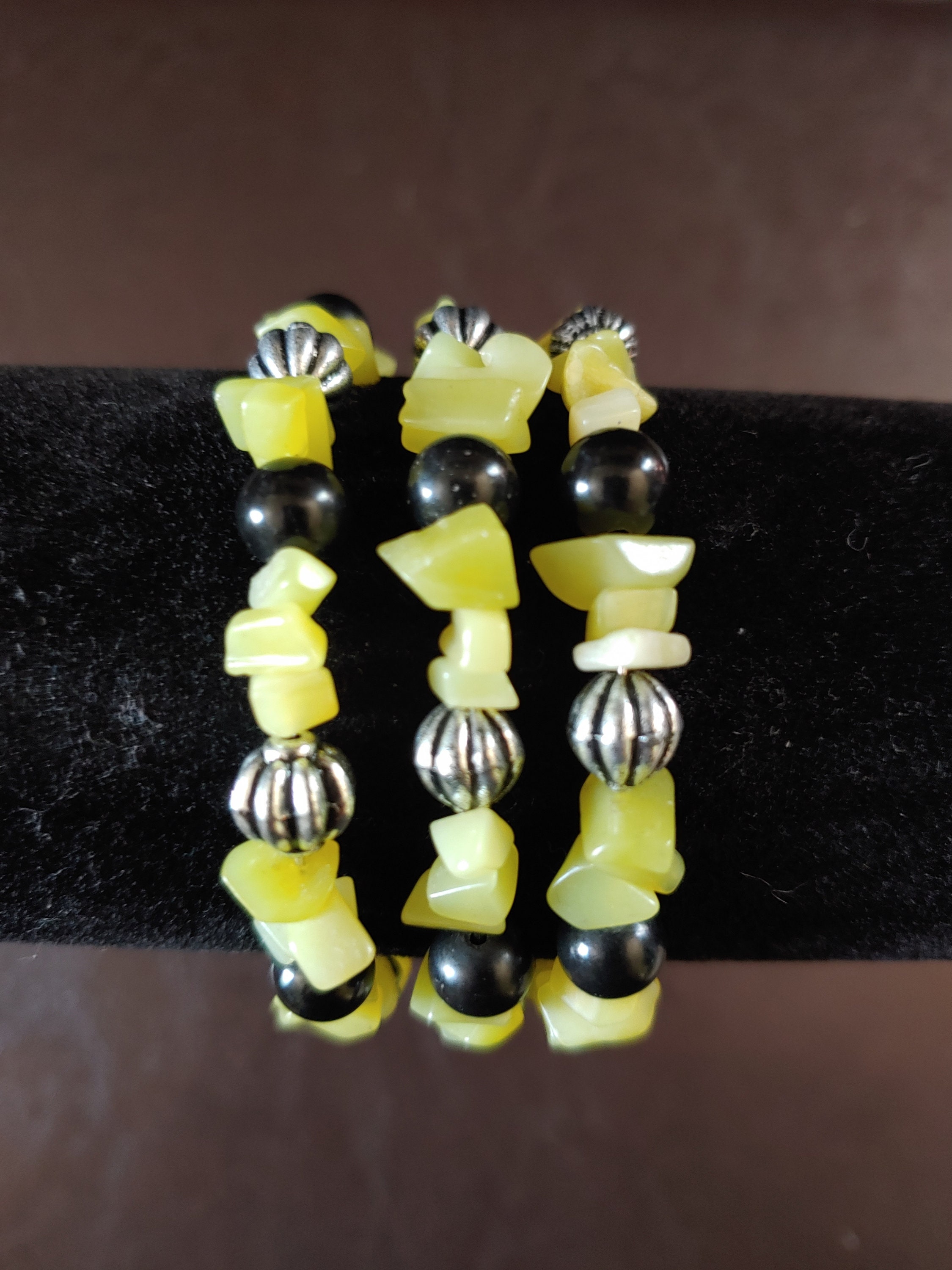 MEMORY WIRE BRACELET WITH BLACK & YELLOW CHIP BEADS. BRACELET COILS AROUND YOUR WRIST. DEPENDING ON THE SIZE OF YOUR WRIST, YOU WILL HAVE TWO OR THREE STRANDS.