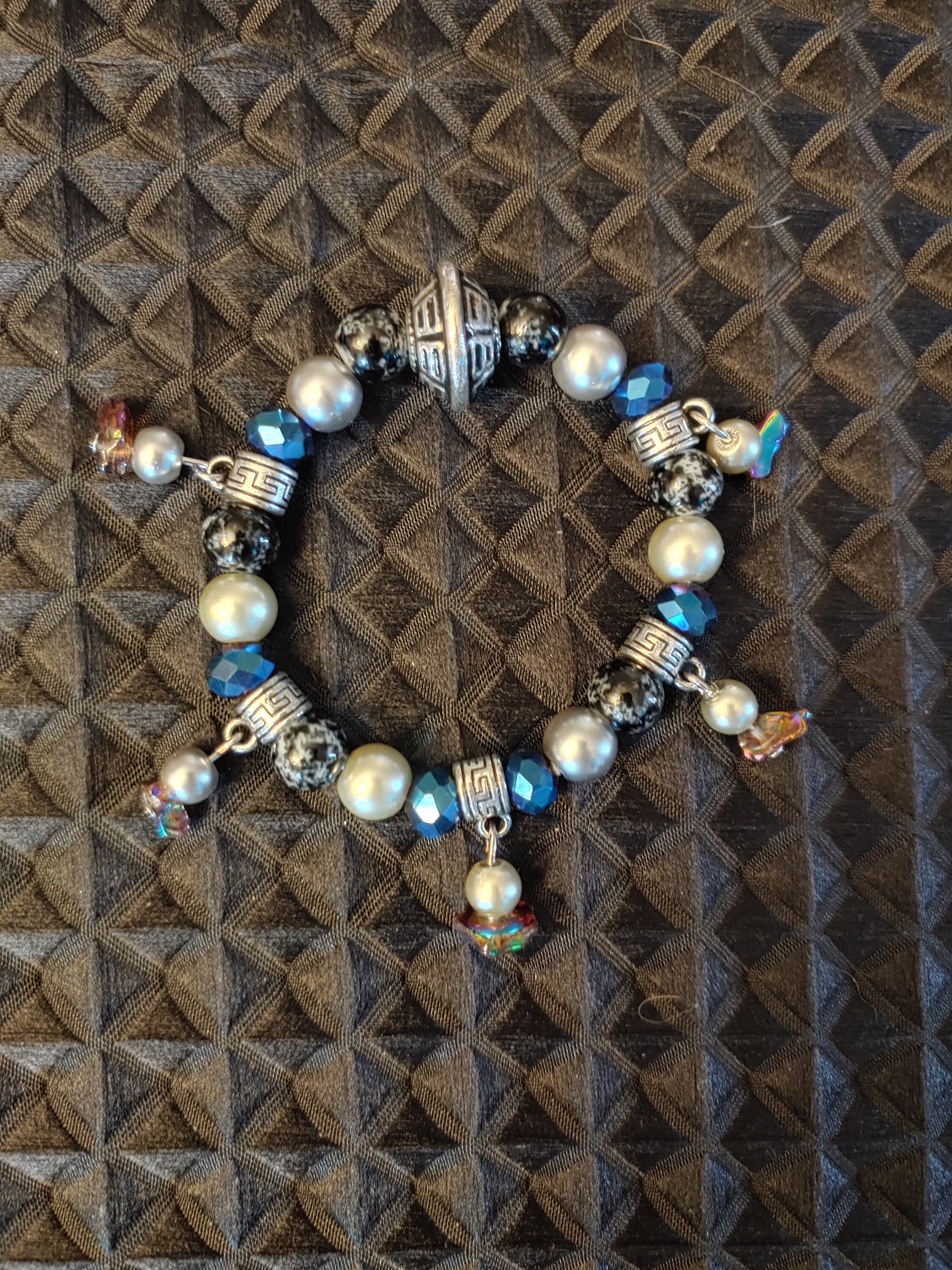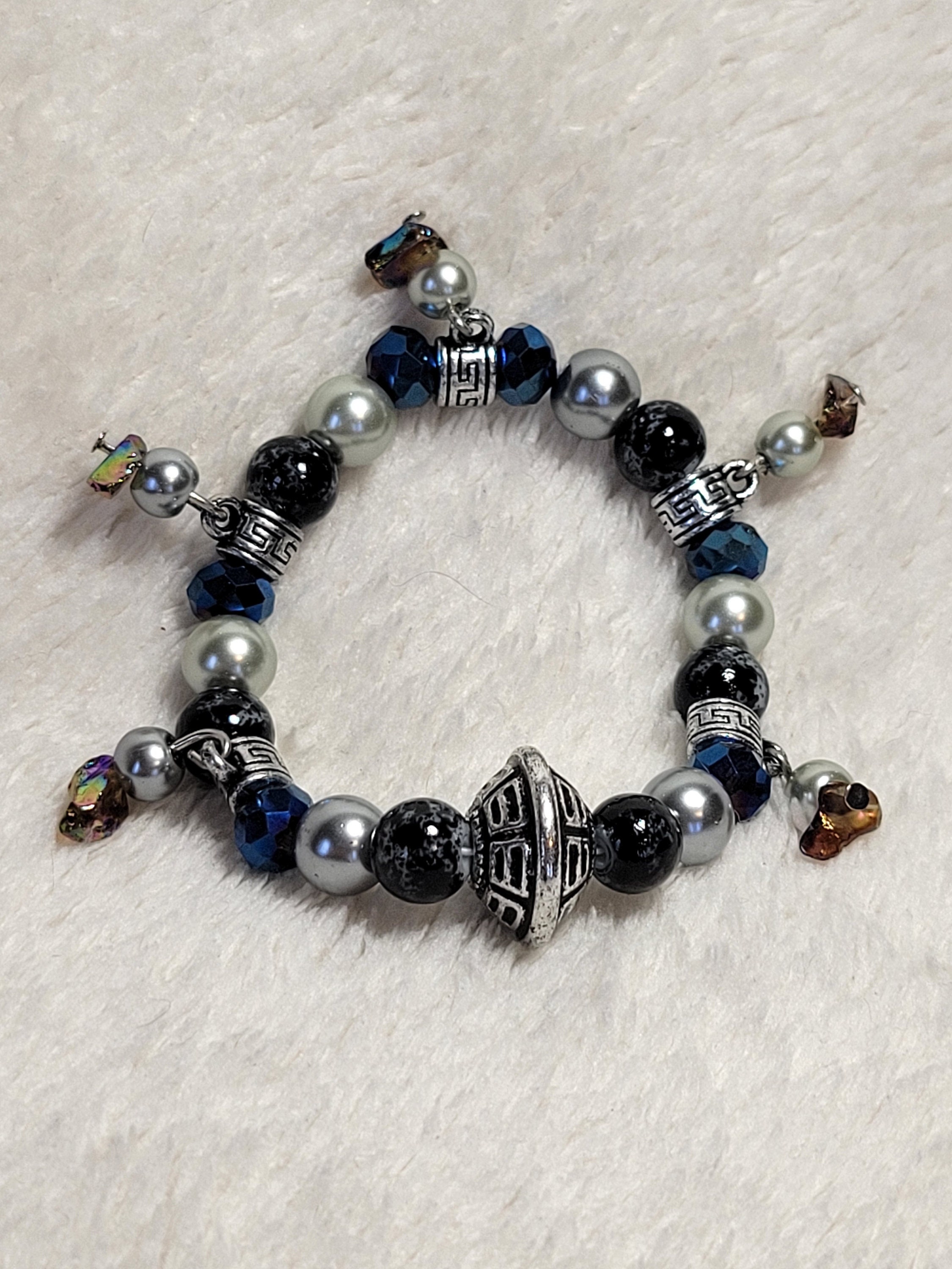 ELASTIC BRACELET WITH SILVER PEARL WITH BLACK BEADS & SILVER PEARL DANGLES