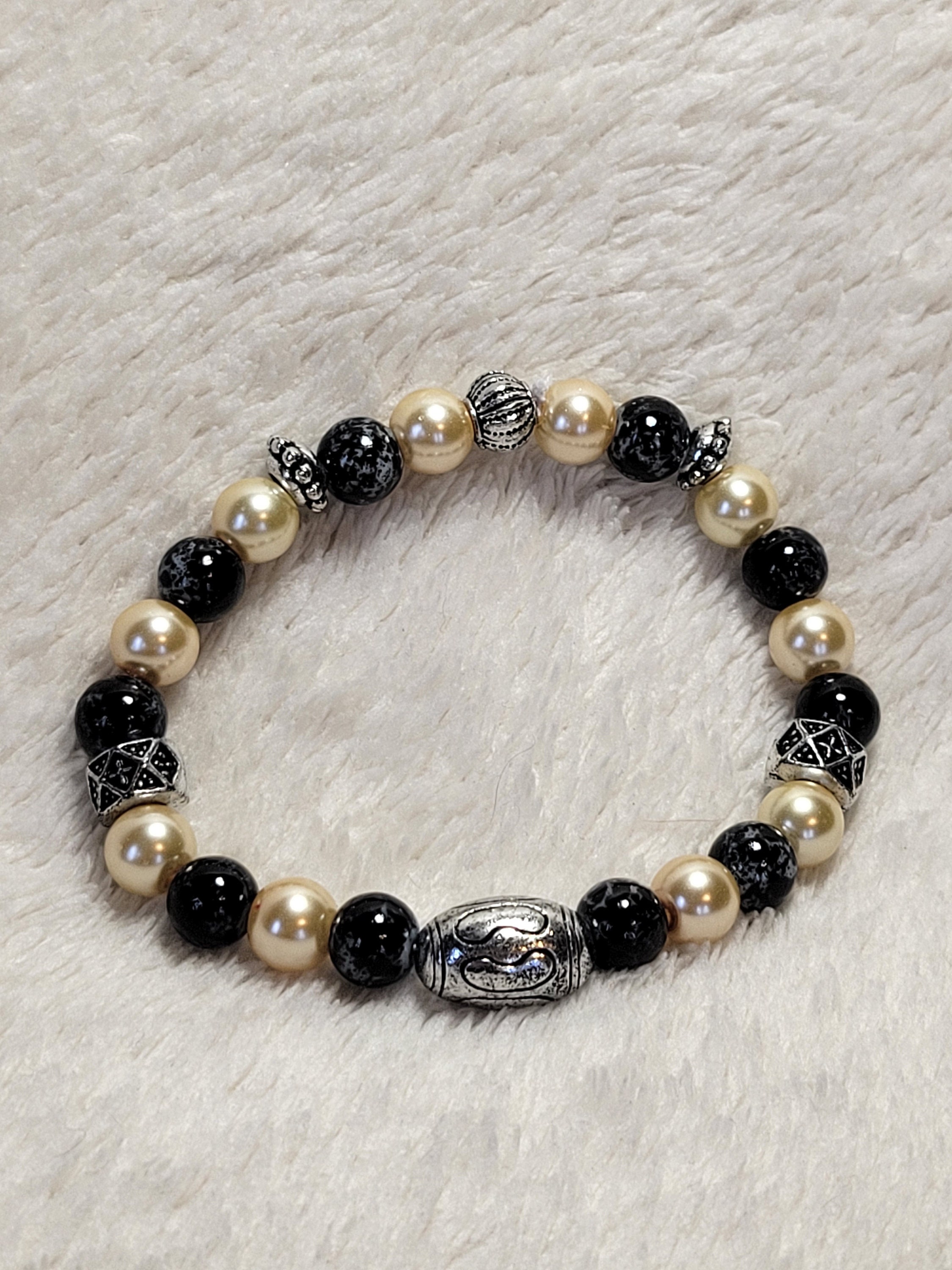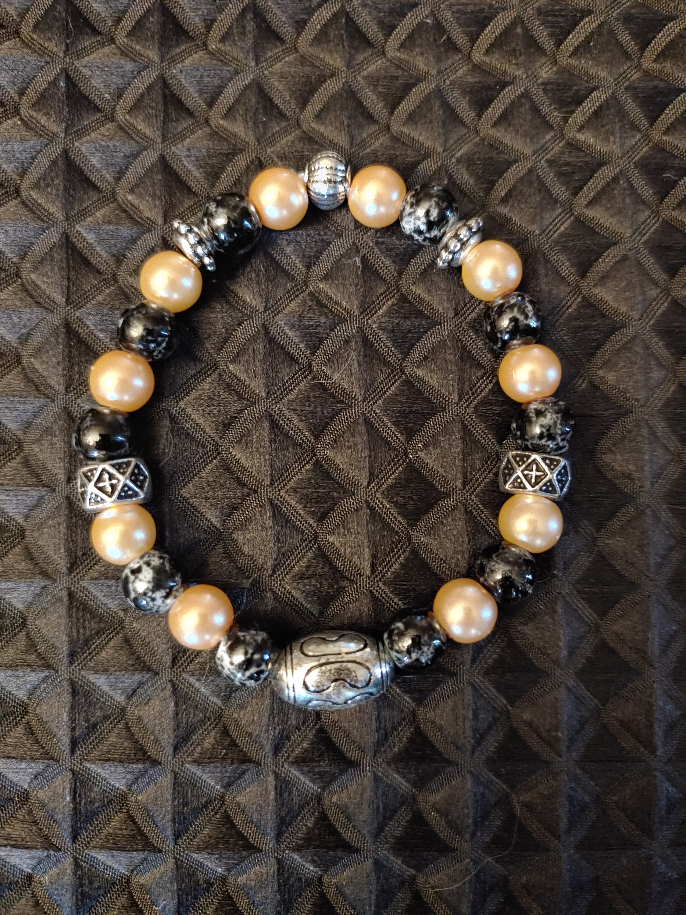 ELASTIC BRACELET WITH PINK GLASS PEARLS & BLACK BEADS
