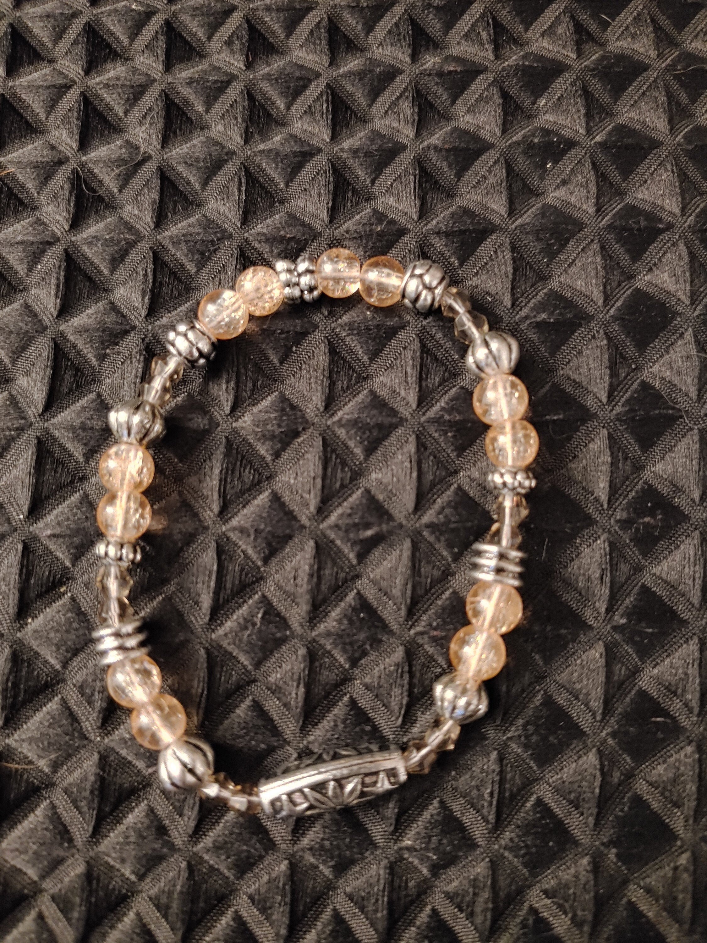ELASTIC BRACELET WITH PURPLE SEED BEADS WITH PEACH BEADS.