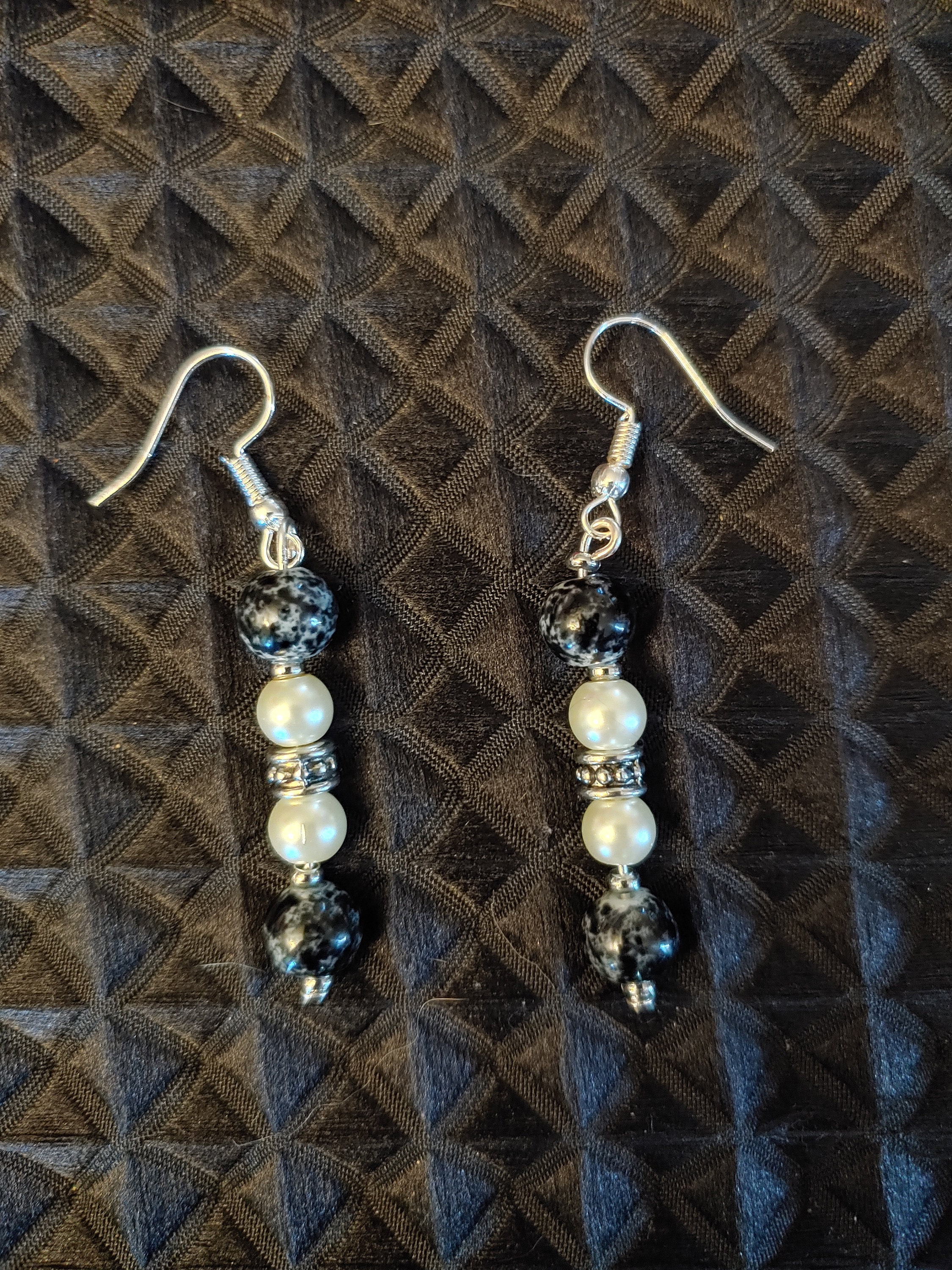 FISH HOOK DROP EARRINGS WITH WHITE PEARL & BLACK/WHITE STONE.