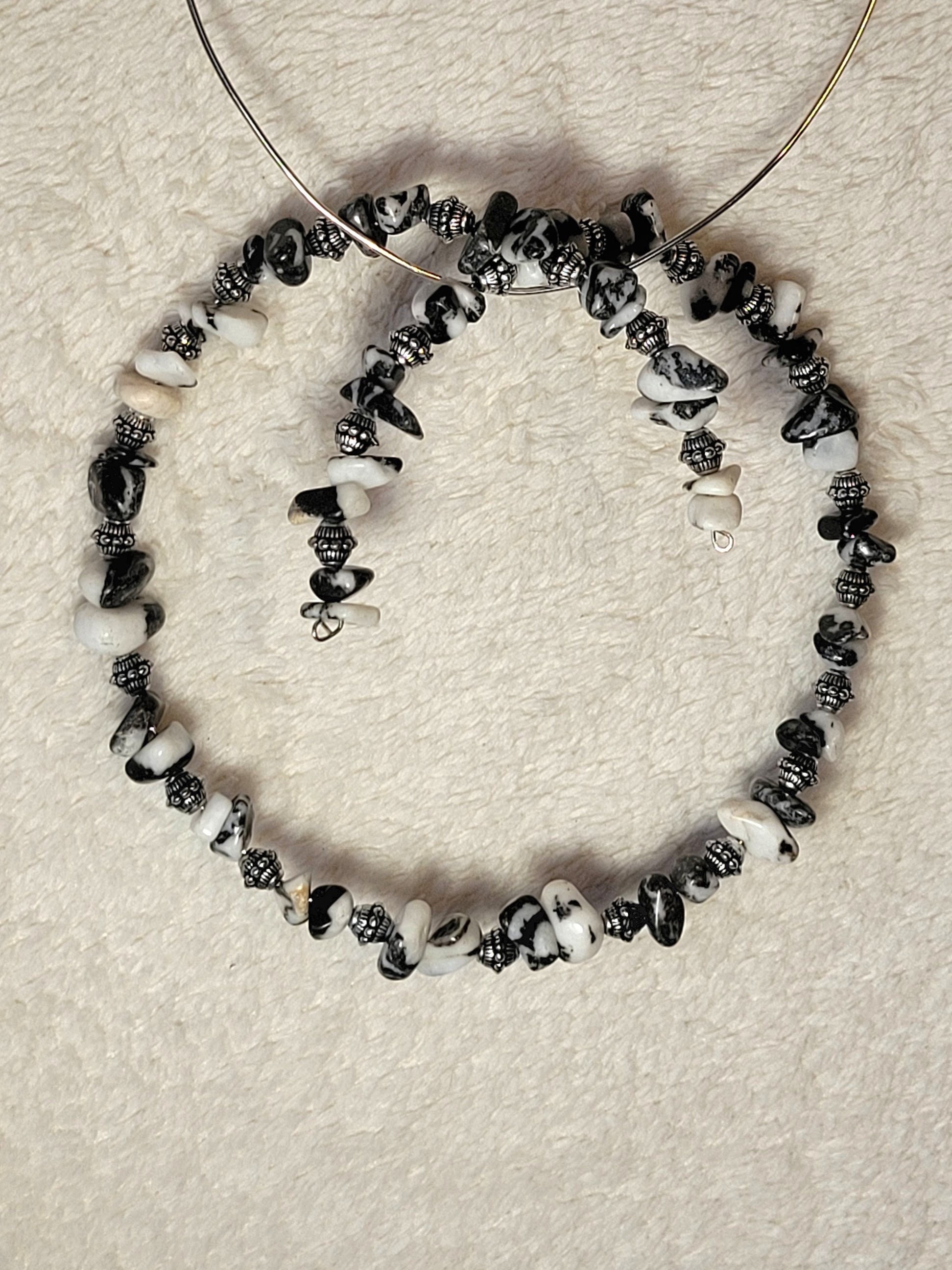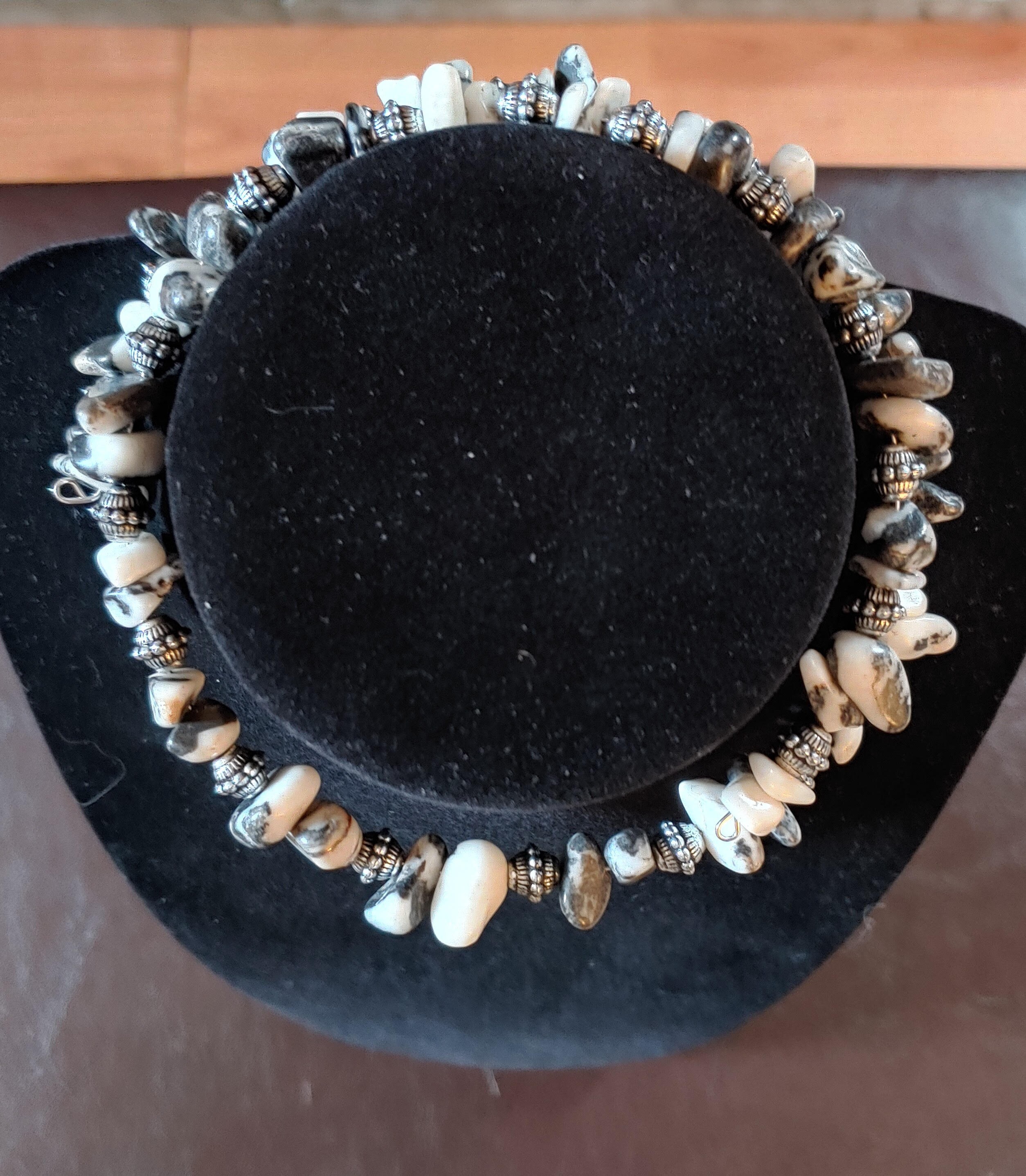 MEMORY WIRE CHOKER STYLE NECKLACE WITH ZEBRA JASPER BEAD CHIPS.
