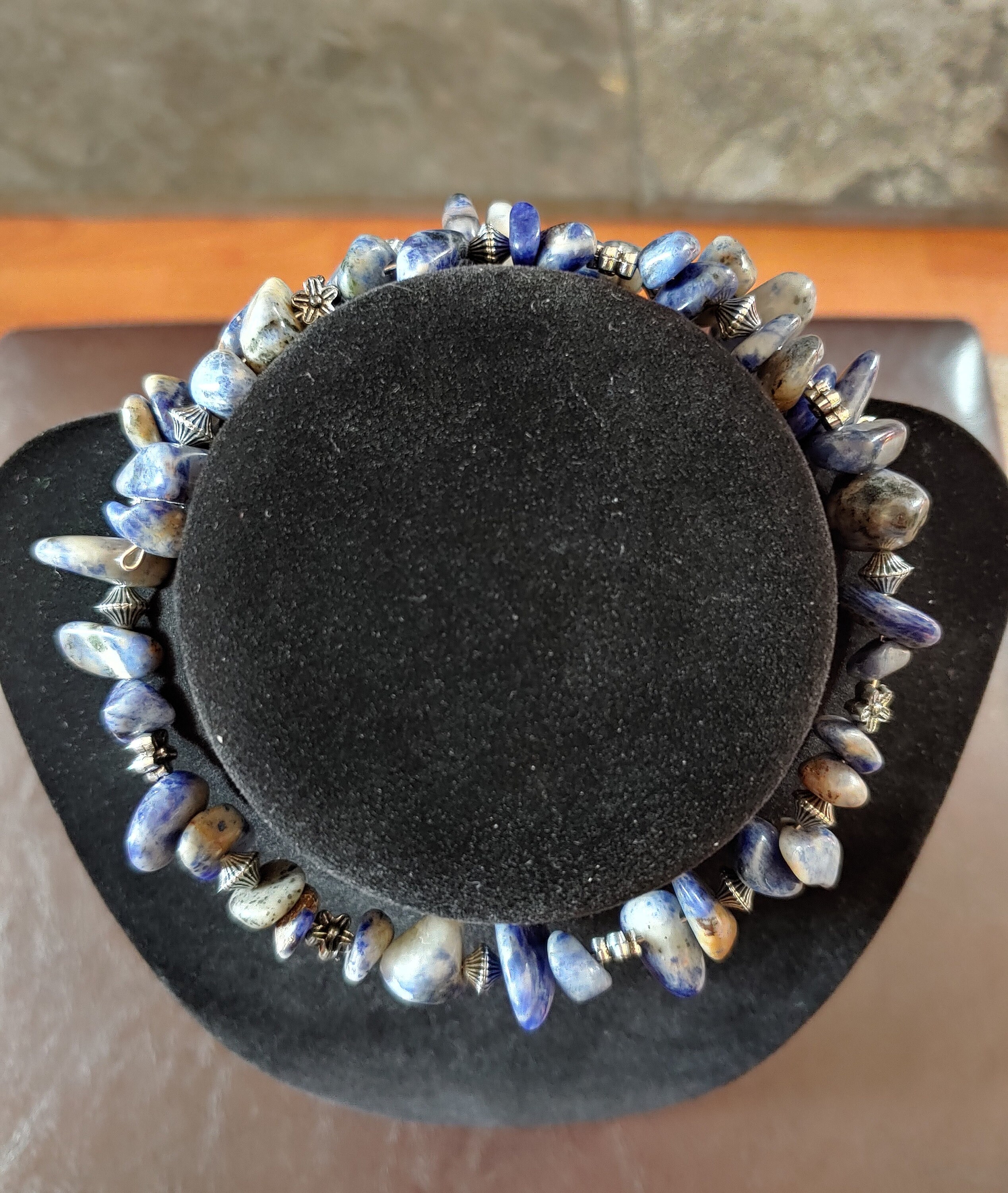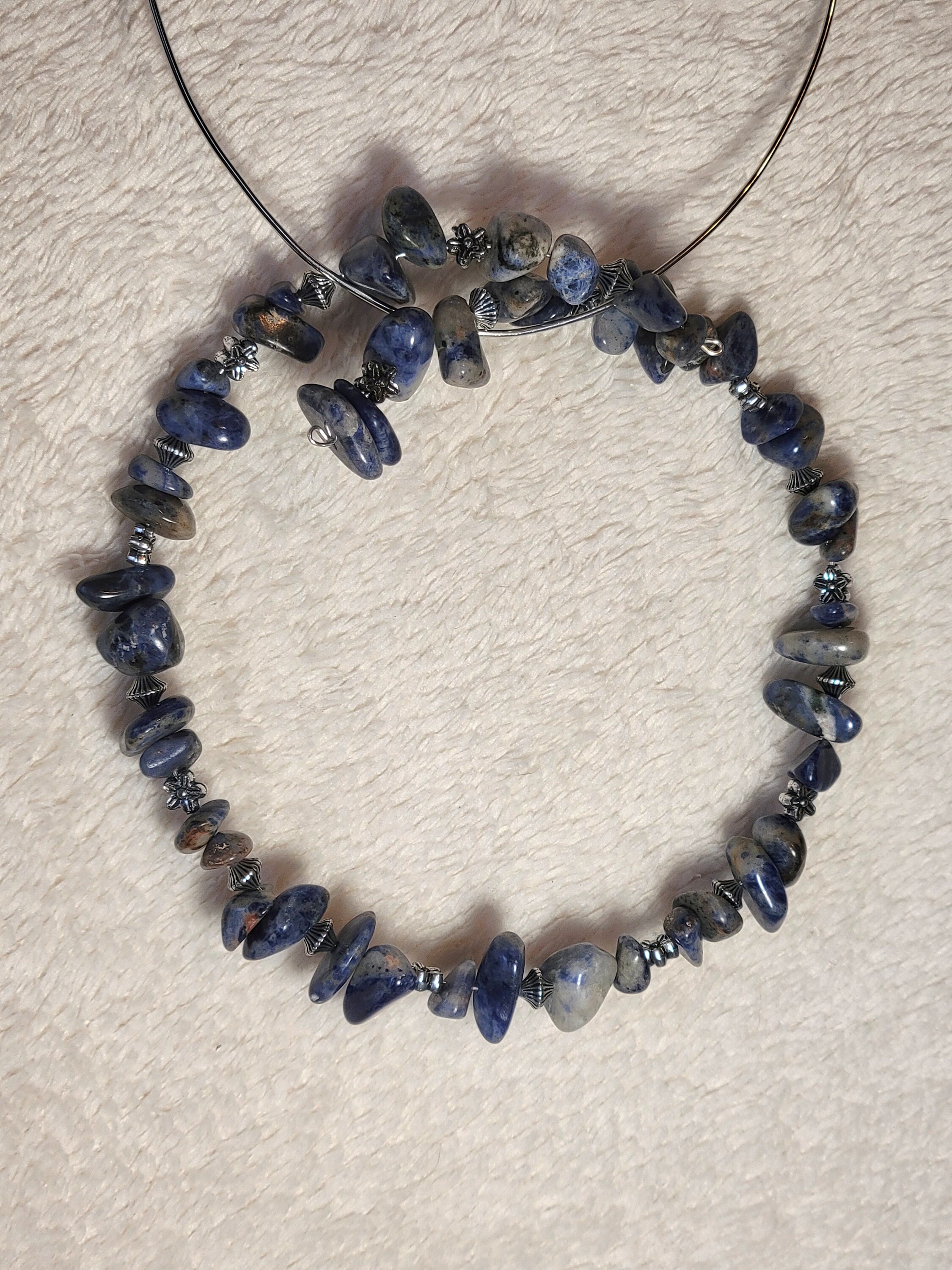 MEMORY WIRE CHOKER STYLE NECKLACE WITH SODALITE BEAD CHIPS.